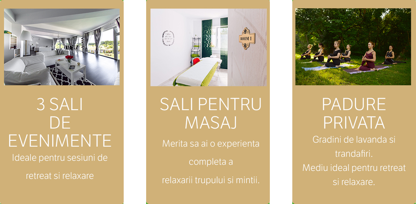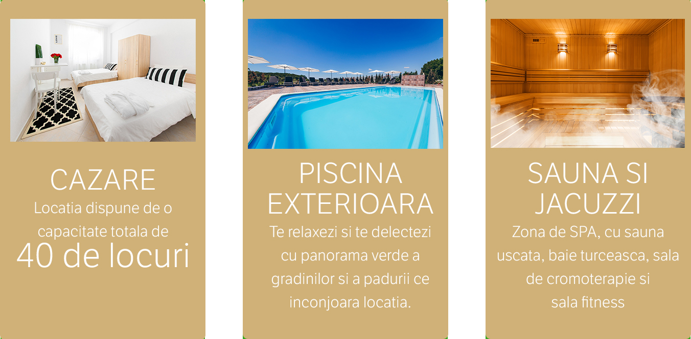 Un spatiu multifunctional cu dotari premium, in culori calde care imbina sub acelasi acoperis zona de Wellness & Tratamente cu piscina exterioara, sauna si jacuzzi, precum si sali de evenimente cu gradina & terasa pe acoperis si 40 de locuri de cazare in camere twin si apartamente cu baie proprie.